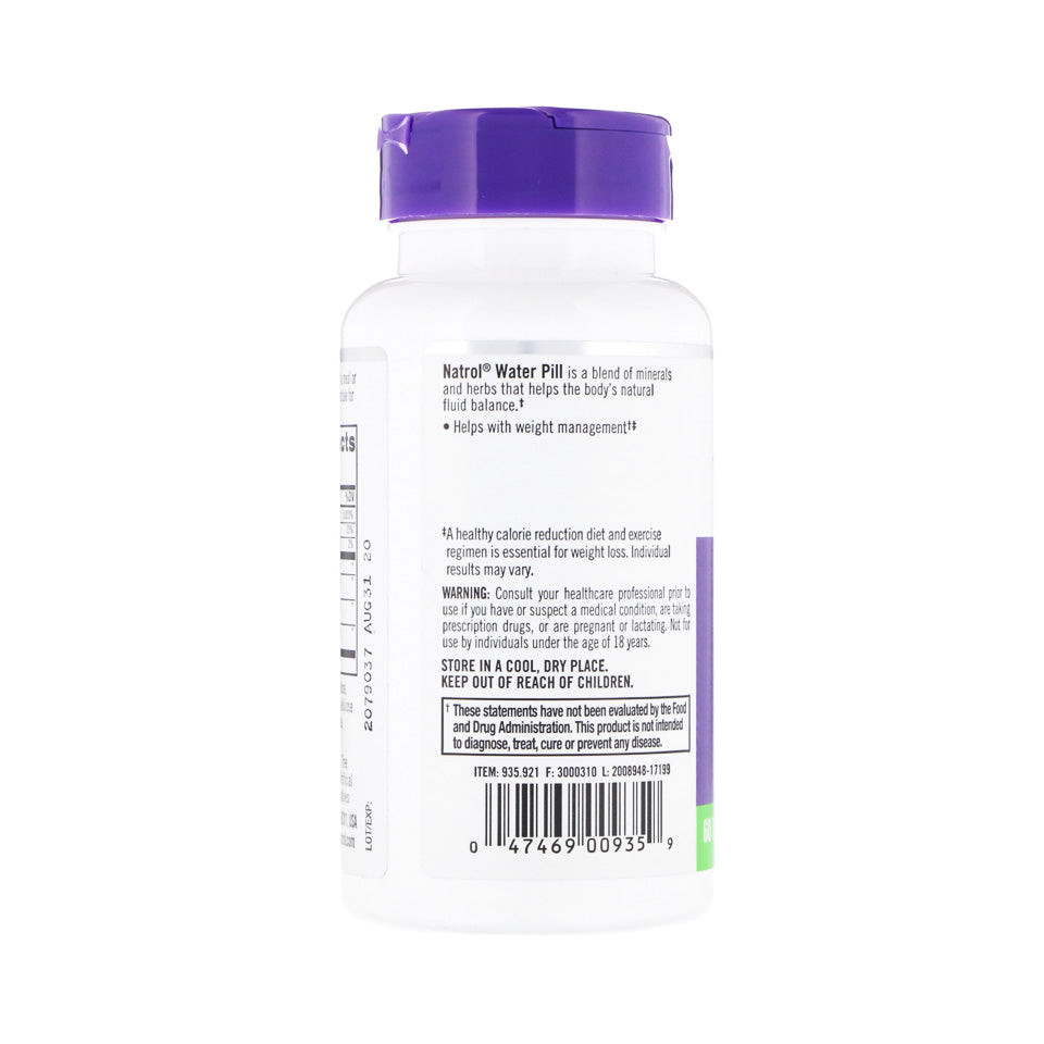 La píldora de agua Natrol es una mezcla de minerales y hierbas que ayuda al equilibrio natural de fluidos del cuerpo. Ayuda con el control de peso. Una dieta saludable para la reducción de calorías y un régimen de ejercicio es esencial para perder peso. Los resultados individuales pueden variar.