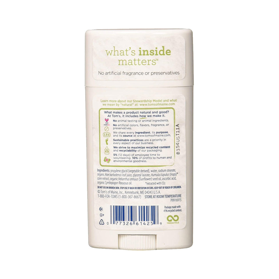 Tom's of Maine utiliza ingredientes de origen natural y derivados naturales para crear productos de cuidado personal que funcionan. Este desodorante natural está diseñado para protegerse del olor durante 24 horas. El desodorante Toms no utiliza conservantes ni fragancias artificiales.