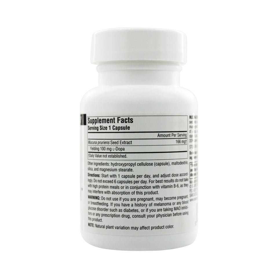 Mucuna Dopa utiliza un potente extracto de la semilla de Mucuna pruriens que ayuda en la función cerebral, la libido y el crecimiento muscular de apoyo. Mucuna pruriens contiene altas concentraciones de L-Dopa, un neurotransmisor que provoca un estado mental positivo de acción y asertividad. Source Naturals Mucuna Dopa viene en cápsulas vegetarianas de 100 mg. *Nota: la variación natural de la planta puede afectar el color del producto.
